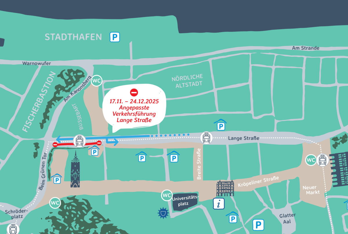 Bei der Fahrt in Richtung Innenstadt sollten die dynamischen Anzeigen des Parkleitsystems zu freien Plätzen beachtet werden. Alle Parkhauser in der Innenstadt sowie die Parkhäuser entlang der Langen Straße sind auch während des Weihnachtsmarktes erreichbar. Zu- und Abfahrten sind von Am Strande (L 22) kommend über die Grubenstraße und die Krämerstraße möglich.