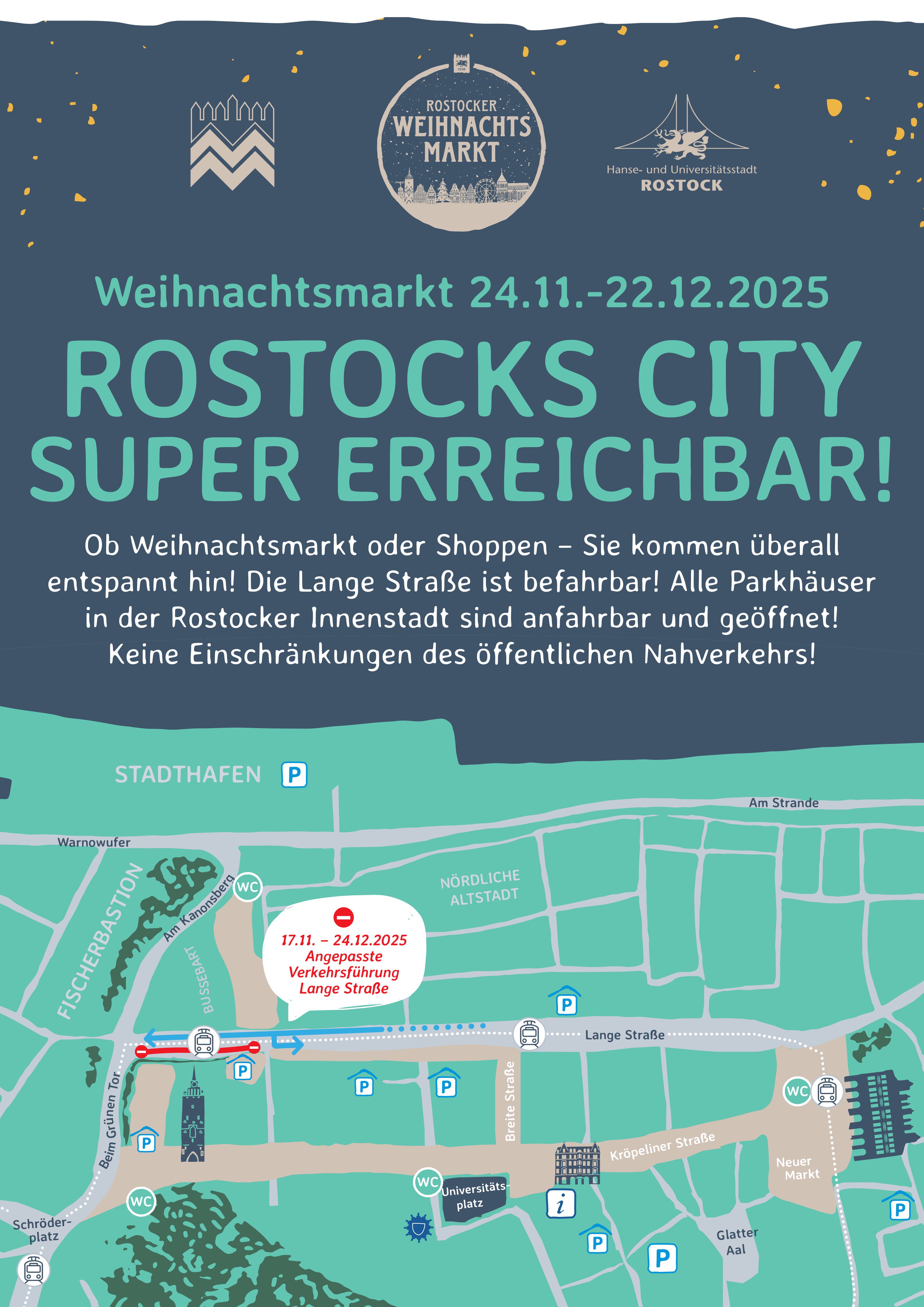 Gerade während der Advents-Wochenenden empfiehlt sich die Anfahrt zum Rostocker Weihnachtsmarkt und zum Adventsshopping in der Rostocker Innenstadt mit öffentlichen Verkehrsmitteln, stau- und stressfrei und ohne lästige Parkplatzsuche. Straßenbahnen und Busse der Rostocker Straßenbahn AG fahren freitags ab 20 Uhr und an den Adventswochenenden zu bestimmten Zeiten in kürzeren Takten.